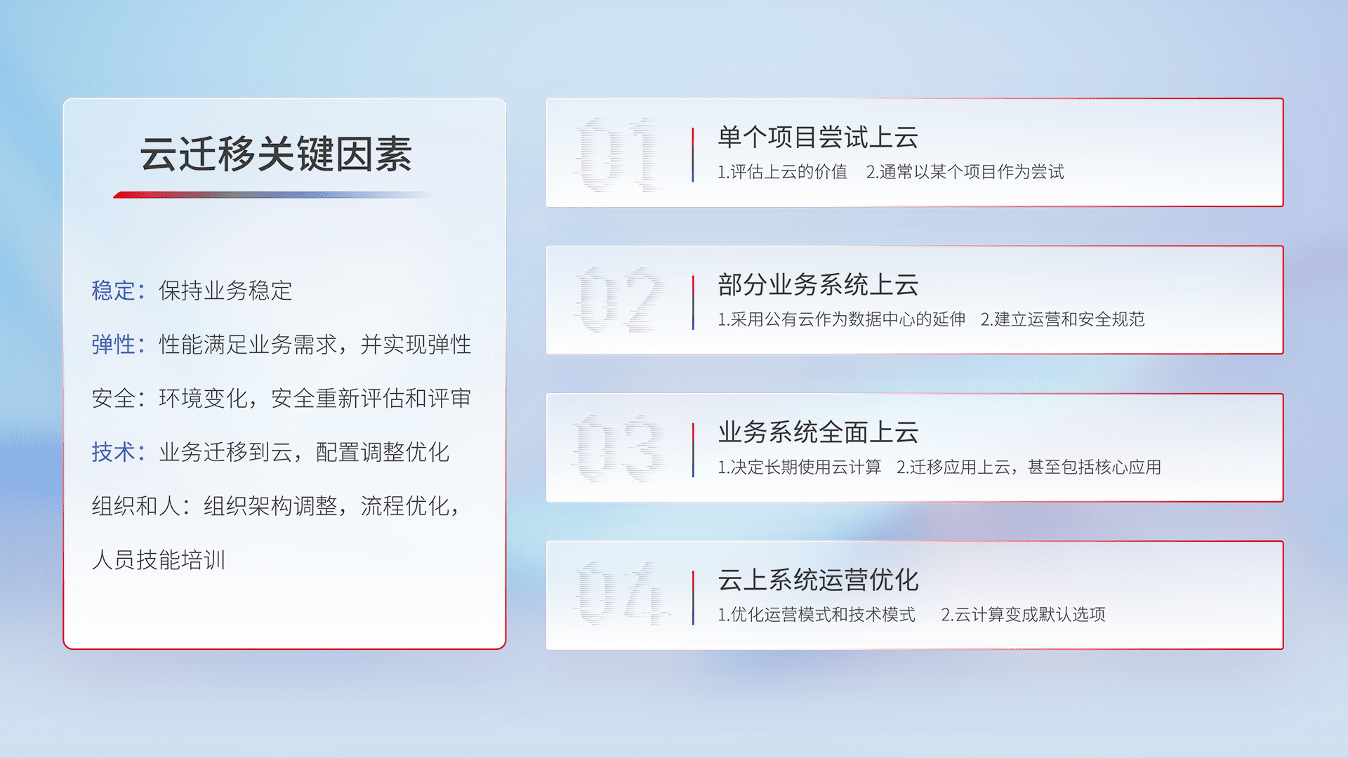 结合实际业务,,,,从规划设计、、、云平台选型、、、云原生改造、、、、数据迁移、、、集成交付,,,,迁移全过程为客户识别最佳上云路径,,,做好风险识别管理,,设计网络架构、、身份权限、、安全审计合规、、、操作审计、、日志审计、、、监控告警策略、、、、多站点容灾设计等,,,,对云上基础设施进行整体规划,,,提升IT治理水平,,,以满足弹性、、高可用、、高性能的需求。。