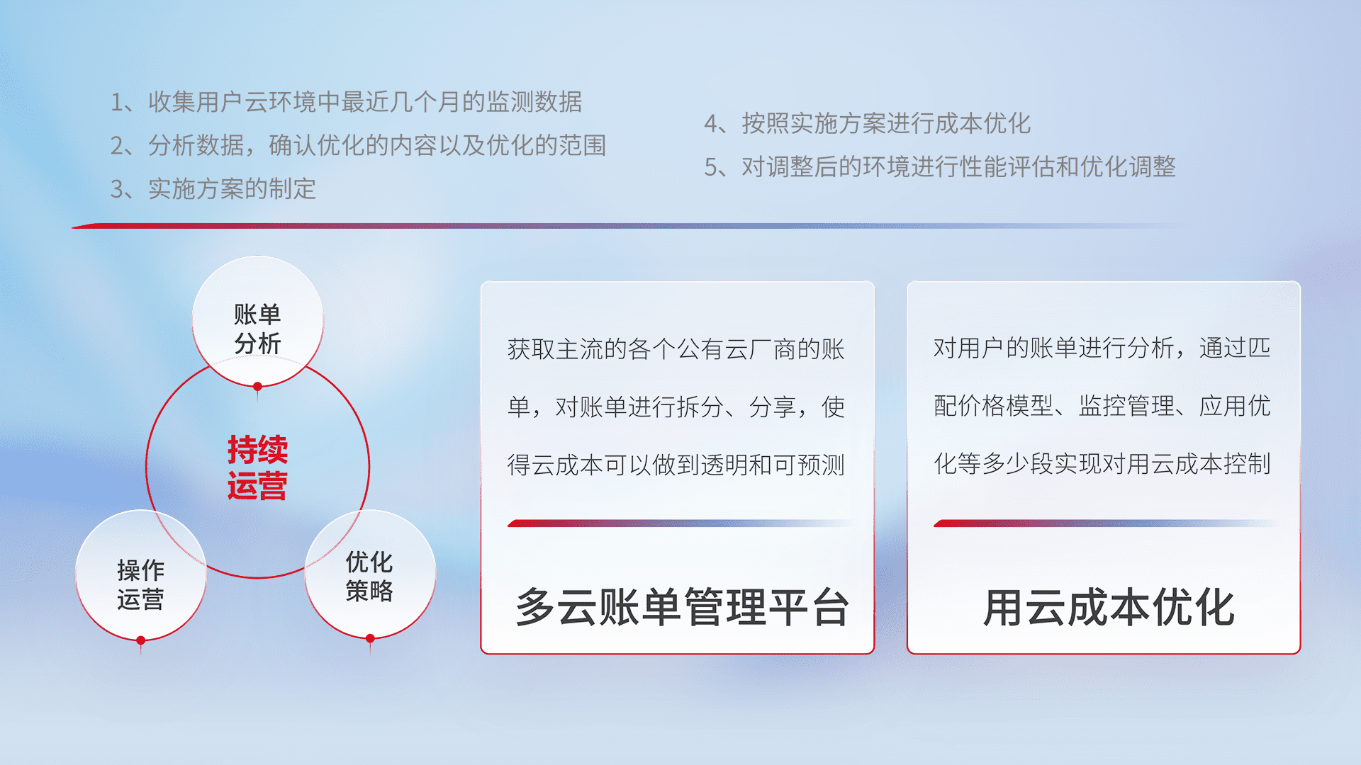 通过多云纳管,,,,以统一的资源数据模型把客户的云资源进行抽象和封装,,进而实现对多云资源的统一操作,,,保障云资源管理的可靠性、、、、稳定性与可用性。。量身定制化运维内容,,,配置、、、、开发运维、、补丁管理、、、备份、、、、监控、、、认证和访问管理、、审计和日常巡检等,,,,保障在用云过程中的可靠度,,,稳定度以及高可用率。。。。