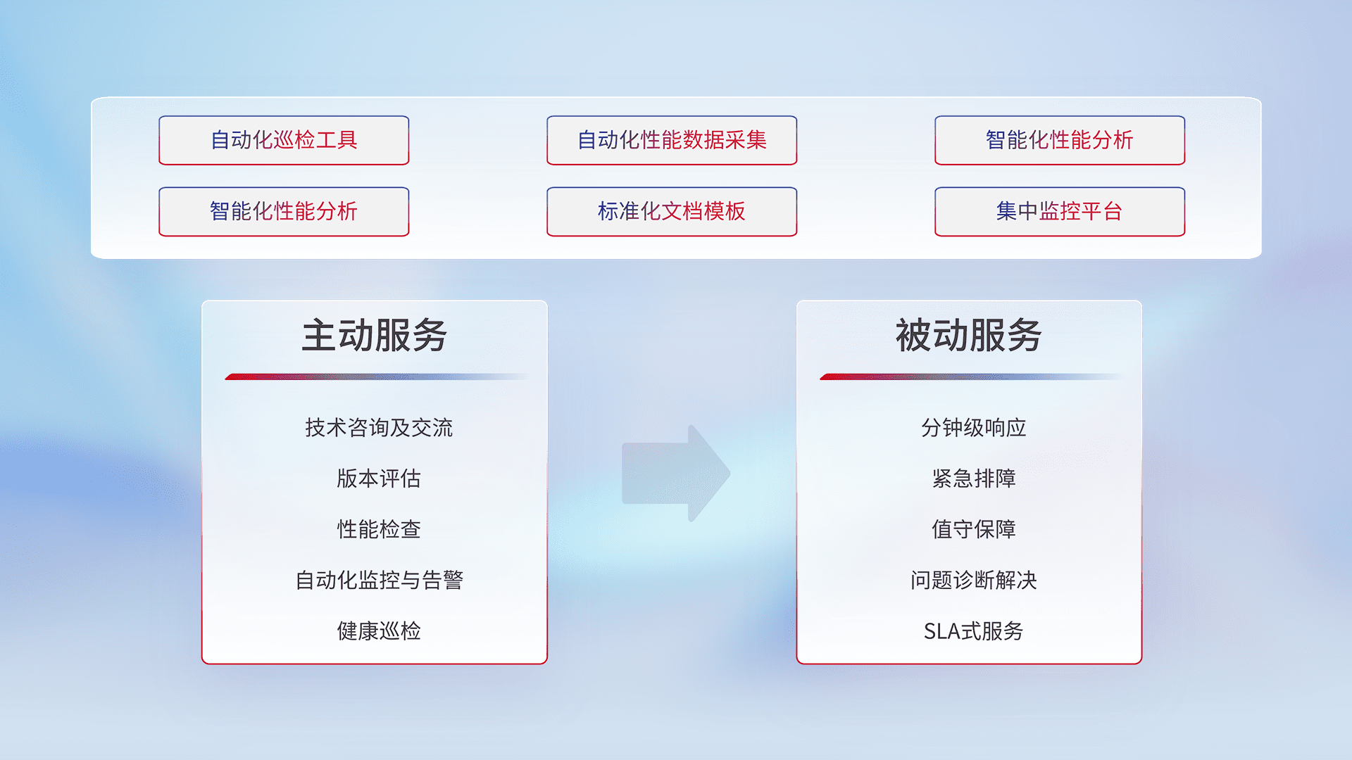 智能化工具和标准化文档,,,保障服务质量,,提供主动服务(包含技术咨询、、、、版本评估、、、、性能检查、、自动化监控与告警、、、、健康巡检)和被动服务包含(分钟级响应、、紧急排障、、、、值守保障、、、问题诊断解决、、SLA服务)。。